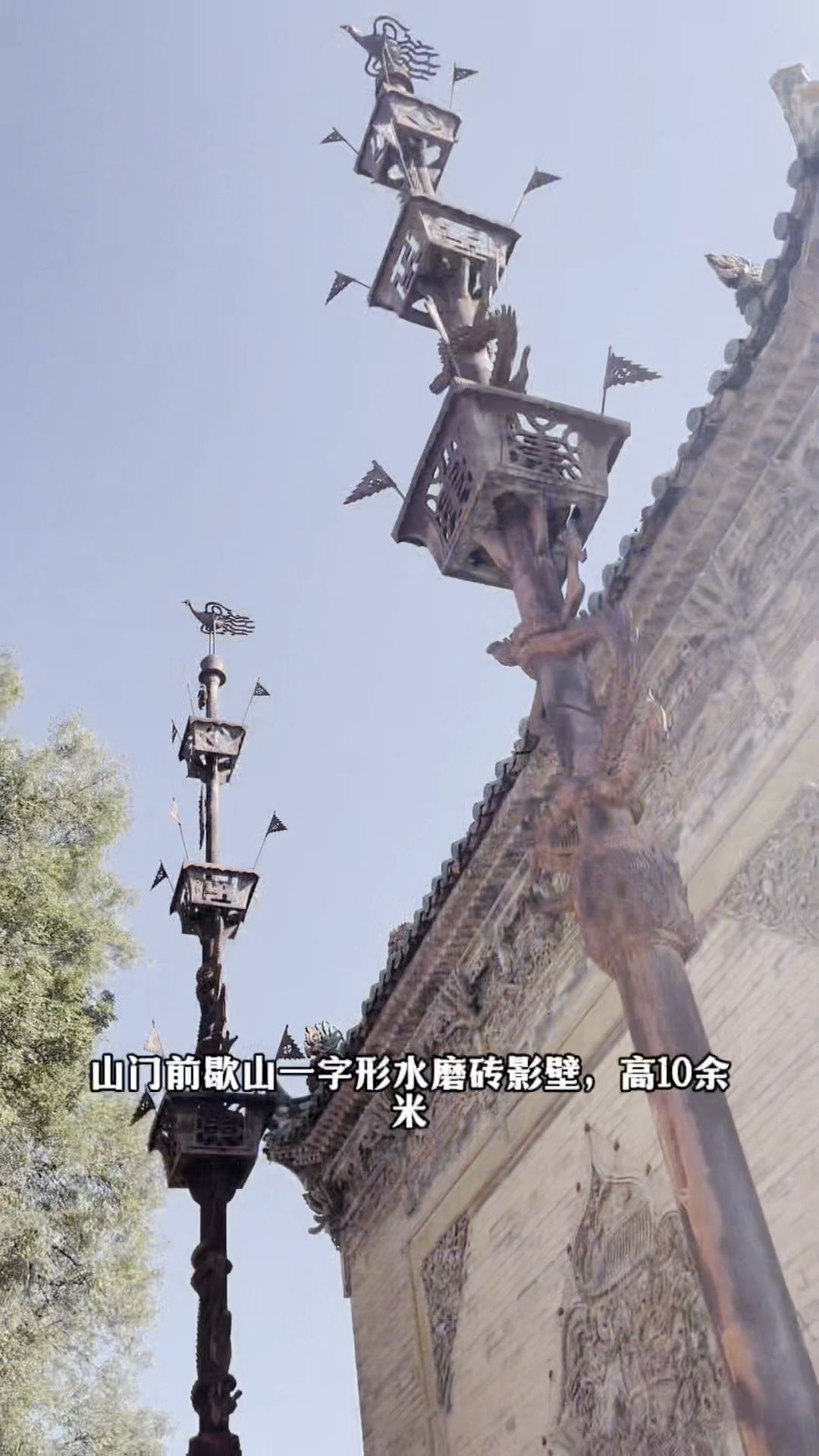 山门前歌山一字形水磨砖影壁,高10余米,中间镶嵌有透雕的"鲤鱼跳龙门"。影壁前有两万余斤重的一对铁旗杆,铁龙缠绕、气宇轩昂。山门东西八字墙上有"苍龙训子"和"鱼龙变化"的砖雕,形象逼真,栩栩如生。戏楼内部由10根金柱承托,雀替、梁杭均有"苍龙戏鳌"等木雕图案。